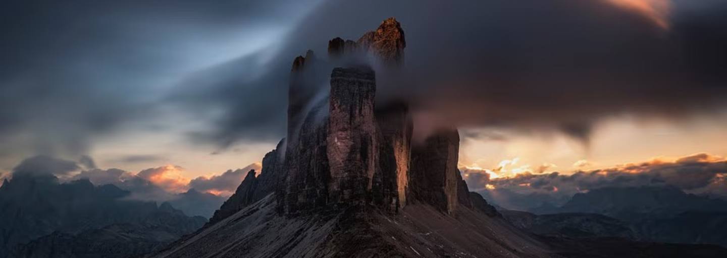 Zu einer einzigen zusammengefaltet zeigen sich die Drei Zinnen, auf Italienisch Tre Cime, wenn man sie von Osten betrachtet. Folglich sehen wir im Vordergrund die stark zergliederte Kleine Zinne (2.857 m) mit der Punta di Frida hinter einer Nebelschliere. Davor hebt sich trutzig der Preußturm (2.700 m) ab, benannt nach seinem Erstbesteiger, dem Wiener Klettergenie und Free-Solo-Pionier Paul Preuß. Folgen wir dem Fußweg nach links, so gelangen wir zur Auronzo-Hütte. Nach Norden breitet sich das weitläufige Grava-Longa-Plateau mit den Zinnenseen aus.