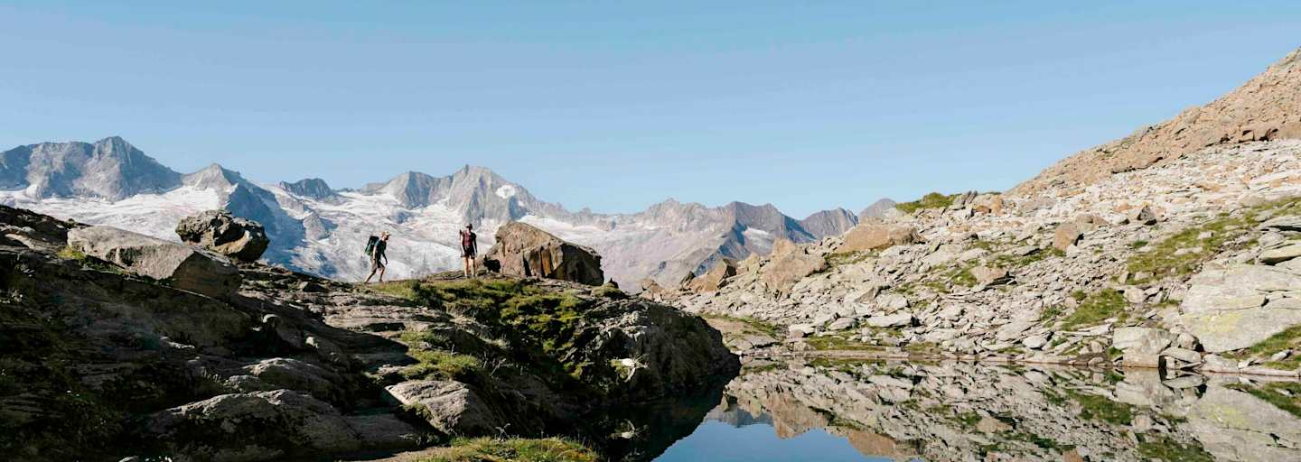 Über stark ausgesetzte und teils seilversicherte Steige führt Etappe 4 vom Furtschaglhaus auf den Gipfel des Schönbichler Horns, das mit 3.134 m den höchsten Punkt entlang des Höhenwegs darstellt. Über Geröll, Almen und Seitenmoränen erreicht man schließlich die festungsgleiche Berliner Hütte (2.044 m).
