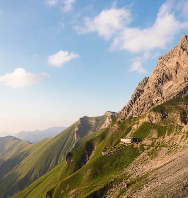 Das Prinz-Luitpold-Haus (1.846 m) ist eine der ältesten DAV-Hütten in den Allgäuer Alpen. Du erreichst es vom Giebelhaus bei Hinterstein in knapp drei Stunden. Bis zur Bärgündle-Alpe kannst du sogar mit dem Fahrrad fahren. Die Hüttenwirte achten bei ihren Speisen auf die Verwendung von Bio-Produkten. Nach einer guten Stärkung kannst du am nächsten Morgen zum beliebtesten Ziel aufbrechen: Auf den 2.592 m hohen Gipfel des Hochvogel dauert es noch etwa 2,5 Stunden.