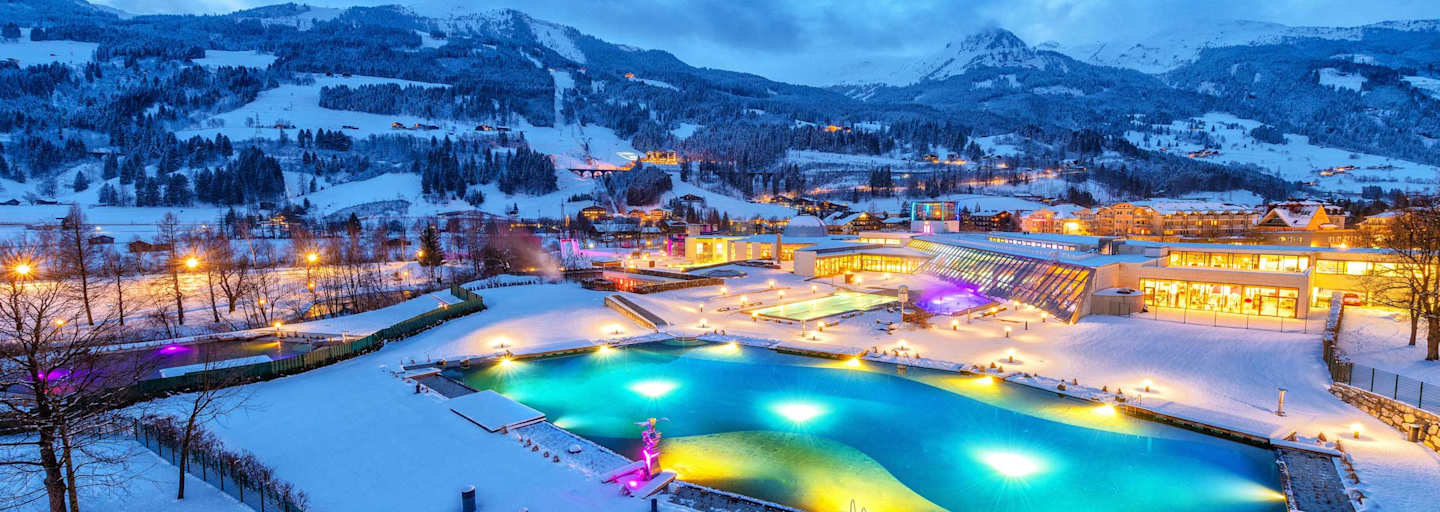 Ruhesuchende Thermengäste kommen in der modernen Therme im Salzburger Land ebenso auf ihre Kosten wie berghungrige Aktivurlauber. In den letzten Jahren wurde die Therme immer wieder erweitert und heute gibt es hier einen Pool, der unter einem Aquarium mit tropischen Fischen liegt, eine Familiensauna, in die auch Kinder Zutritt haben und einen eigenen Bereich nur für Frauen. Alle anderen klassischen Angebote, wie Sauna, Thermalpools und Dampfbad findet man natürlich auch.