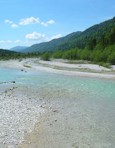 Die Isar stellt sich vor allem in ihrem Oberlauf von Scharnitz bis München als sehr naturnaher Wildfluss dar. Sie entspringt im Hinterautal im Naturpark Karwendel und überquert bei Scharnitz die Österreich-Deutsche Grenze. Sie fließt weiter nach Mittenwald und Krün und füllt bei Vorderiß den Sylvenstein-Stausee. Danach geht die Reise weiter durch die schönen Isarauen bis nach München.