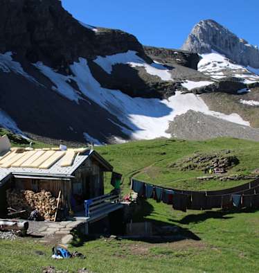 Die Fluhseehütte liegt wirklich fantastisch am Rand einer Geländestufe oberhalb von Lenk im Simmental. Der Zustieg ist zum Teil steil und ausgesetzt. Die kleine, einfache Holzhütte nördlich des Wildstrubels besteht aus einem Raum, in dem man kocht, isst und schläft.