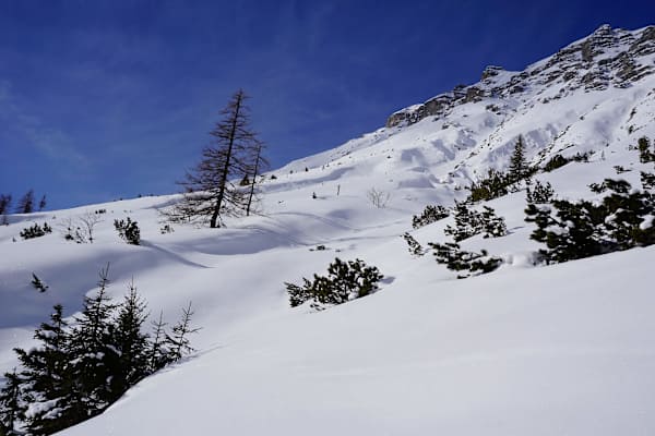 Liegt einmal ausreichend Schnee, sind zahlreiche Touren möglich. Allerdings weisen viele einen hochalpinen Charakter auf und sind aufgrund ihrer Länge und teilweise komplexen Routenführung nicht gerade als trivial einzustufen. Es gibt unzählige Orte, an denen kaum einmal jemand Spuren zieht – mit ein Grund dafür, warum wir unsere Heimatberge für Skitouren dermaßen schätzen.
