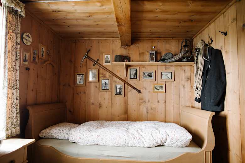 Wer das Doppelzimmer ergattert, schläft gemütlich im rustikalen Ambiente.Foto: Elias Holzknecht, Bergwelten Magazin Schweiz 04/2019