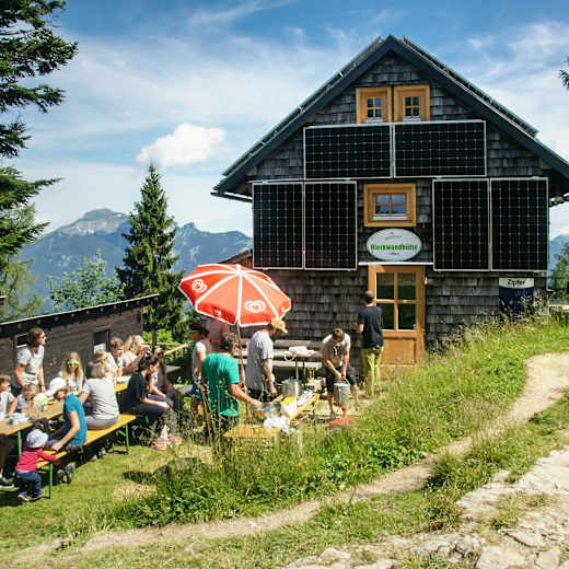 Nicht nur die Lage mit dem gigantischen Ausblick von der Terrasse aus ist den mühelosen Aufstieg wert, er lohnt auch wegen der erstklassigen bodenständigen Küche. Es soll dabei Leute geben, die – der eher einfachen Ausstattung der Hütte zum Trotz – allein schon wegen des Frühstücks gerne hier übernachten. Für Kinder gibt’s vor der Hütte einen kleinen Spielplatz, darüber hinaus eine Lagerfeuerstelle.