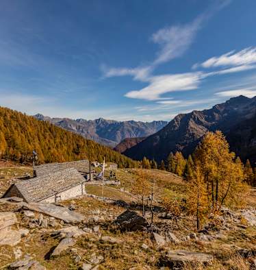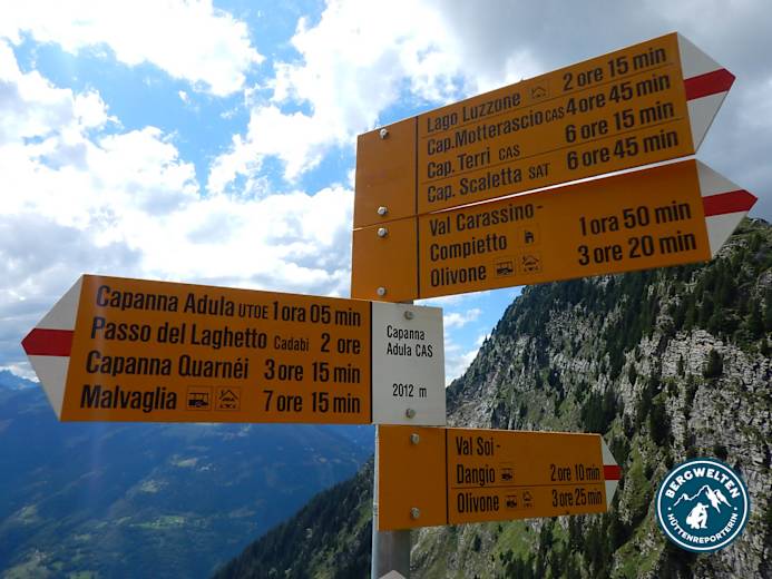 Läntahütte (2.090 m, 9 h), Capanna Quarnei (2.107 m, 5 h), Capanna Zapport (2.276 m, 5 h), Capanna CAS Motterascio Michela (2.172 m, 4 h), Capanna Bovarina (1.870 m, 5:30 h)