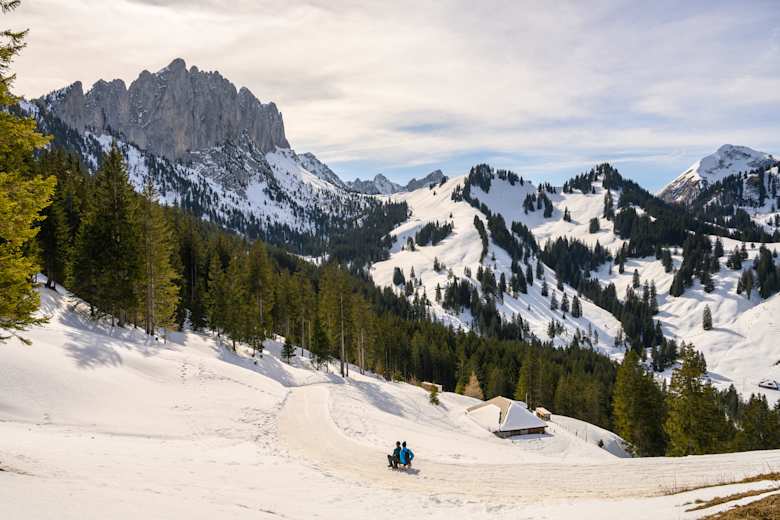 Schneeschuhwandern/Skitouren/Schlitteln: Im Winter für alle Art von Aktivitäten besonders beliebt ist der Schneeschuh-Trail ab Jaun (3 h)