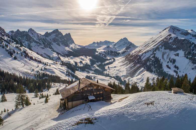 Das Chalet du Soldat (1.751 m) liegt zwischen Gruyère und dem Simmental am Fusse der messerscharfen Kalkfelsen der Gastlosen. Der Blick von der Sonnenterrasse bietet eine prächtige Kulisse: Mächtig thronen die 66 Gipfel des imposanten Bergmassivs entlang der Grenze von Bern, Waadt und Freiburg. In der anderen Richtung: ein fulminanter Ausblick auf die Voralpengipfel Hochmatt (2.151 m), Vanil Noir (2.389 m) und Dent de Ruth (2.236 m).