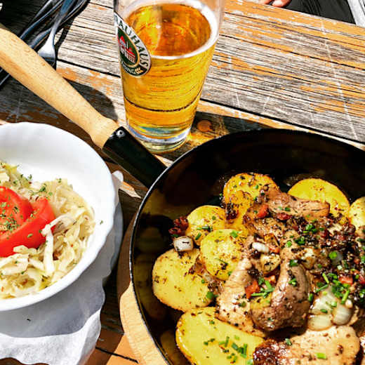 Familie Schranz verköstigt ihre Gäste in gemütlichen Stuben (rund 100 Sitzplätze) und auf der prachtvollen Terrasse (rund 150 Sitzplätze) mit bodenständigen Köstlichkeiten wie dem legendären Gröstl, aber natürlich auch mit Vegetarischem. Für Kinder gibt’s ebenfalls ein spezielles Angebot. Im Inneren sorgt ein Kachelofen für stimmungsvolles Knistern, diverse Brettspiele stehen Groß und Klein zur Verfügung. Spielplatz gibt es keinen, diese Funktion übernimmt hier die Natur.