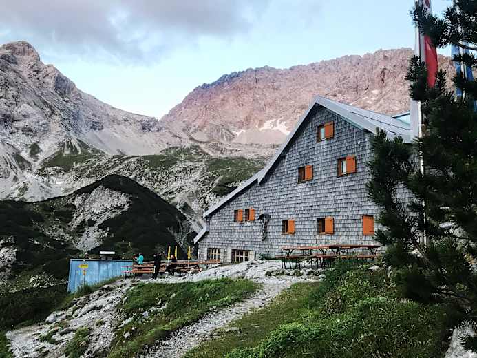 Die nächstgelegene Hütte ist die Breitenkopfhütte (2.020 m, 3 h). Weiters: Wolfratshauser Hütte (1.753 m, 5:30 h); Knorrhütte (2.052 m, 5 h); Wiener-Neustädter-Hütte (2.213 m, 5 h).
