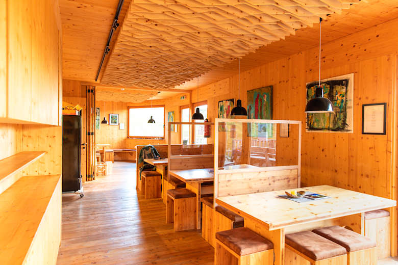 Bekannt ist die Franz-Fischer-Hütte für ihre Architektur – viel Holz und helle Räume.Foto: Ramona Waldner / Red Bull Media House Publishing