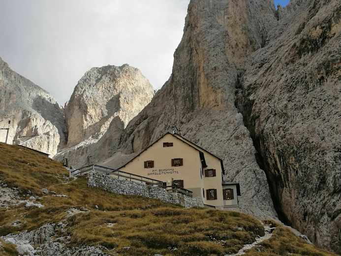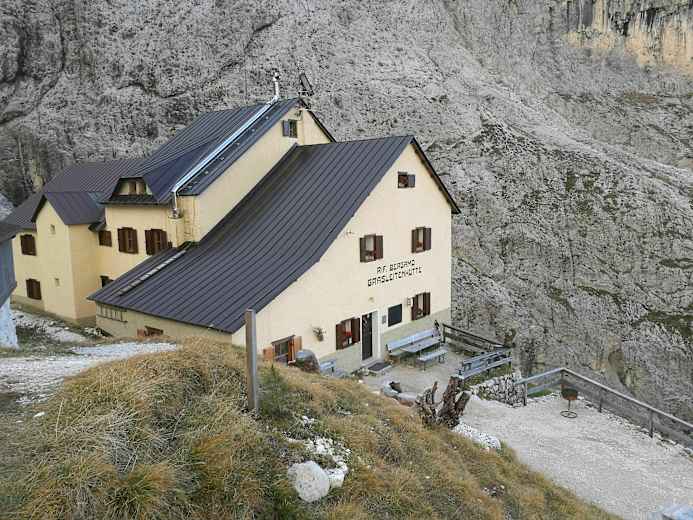 Die Grasleitenhütte (2.165 m) befindet sich mitten im Naturpark Schlern in der Südtiroler Gemeinde Tiers und ist ein idealer Ausgangspunkt für Wanderungen und Bergtouren im wunderschönen Rosengarten- und Schlerngebiet. Die vielen Klettersteige in der Umgebung, etwa auf den Kesselkogel (3.004 m) oder auf die Roterdspitze (2.655 m), lassen vor allem die Herzen von Kletterfreaks höher schlagen.