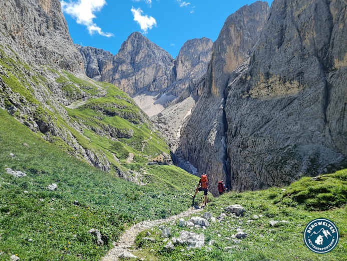 Die nächstgelegene Hütte ist die Grasleitenpasshütte (2.601 m), die in ca. 1:15 h zu Fuß erreichbar ist. Weiters: Antermoiahütte (2.497 m, 2:30 h); Gartlhütte (2.621 m, 2 h); Tierser-Alpl-Hütte (2.444 m, 2 h); Vajolethütte (2.243 m, 1:30 h); Schlernhaus (2.457 m, 3:15 h); Puflatschhütte (1.974 m, 6 h).