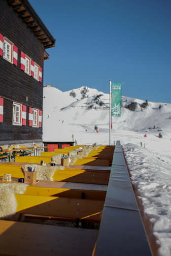 Besonders schön ist es an sonnigen Tagen, wenn man auf der neuen Holzterrasse den Ausblick über das Skigebiet Bad Hofgastein genießen kann.