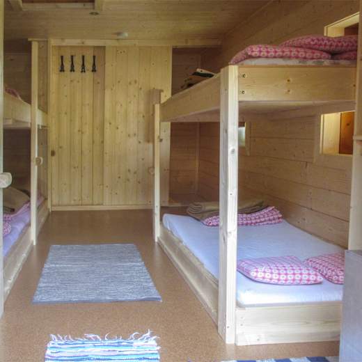 Das Herzstück der einfachen Hütte ist der große Holzofen zum Heizen und Kochen im kleinen Aufenthaltsraum, der knapp 20 Personen Platz bietet. Die Schlaflager befinden sich im Obergeschoss. Vor der Hütte – Sitzmöglichkeiten sind vorhanden – gibt’s eine große Lagerfeuerstelle.