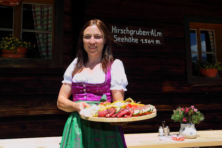 - Auf der Hirschgrubenalm werden vor allem hofeigene Produkte angeboten.Foto: Thomas Wirnsperger, TVB GroßarltalDie HirschgrubenalmFoto: Thomas Wirnsperger, TVB GroßarltalDer Infoplatz auf der HirschgrubenalmFoto: Thomas Wirnsperger, TVB Großarltal