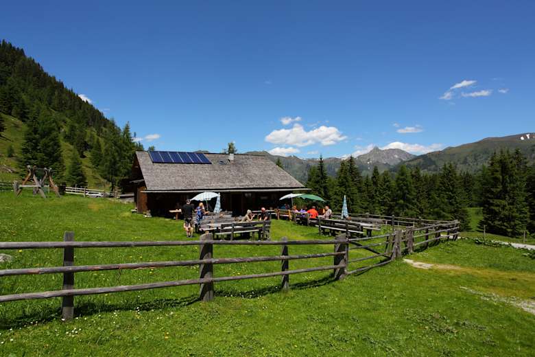 Wanderer mit Kinderwägen und Mountainbiker nutzen vom Bauernhof Oberneureit bei Hüttschlag im Großarltal den Forstweg, der in angenehm sanfter Steigung direkt zur Alm führt. Wanderer können hingegen auf einen Steig abzweigen, der durch den Wald aufwärts zur Alm führt.