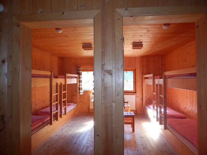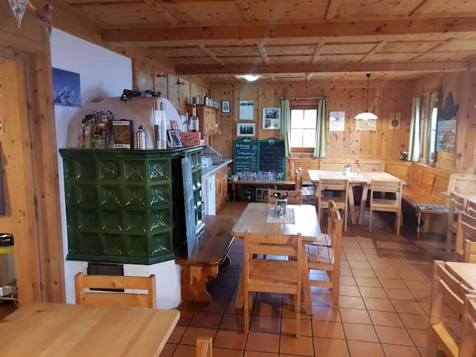 Sehr gemütliche Gaststube mit Kachelofen, vor dem Haus stehen ein paar Tische und Bänke. Zur Hütte gehört auch eine ökologische Lehmsauna, die allen Besuchern zur Verfügung steht. Auch Lamatracking wird angeboten. Übernachtung mit Hunden auf Anfrage.