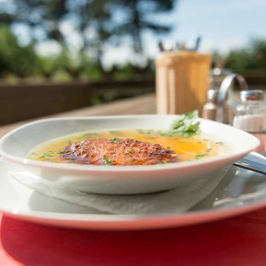 Hüttenwirt Adalbert Mikstetter bekocht seine Gäste mit Hausmannskost - Kaspressknödelsuppe, Bärlauchstrubel, Knödel mit Kraut, Chicken Wings, etc. - und mit Schmankerl wie Rindsrouladen, Spanferkel-Stelzen, Krenfleisch, Würstelgulasch und Steckerlfische. Wer nach seinen Suppen und Hauptspeisen noch kann, wie etwa Mountainbiker, kann sich Marillenknödel oder Buchteln mit Vanillesauce gönnen. Dazu ein gepflegtes Bier, oder Radler und einen Verdauungsschnaps.