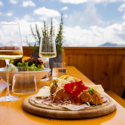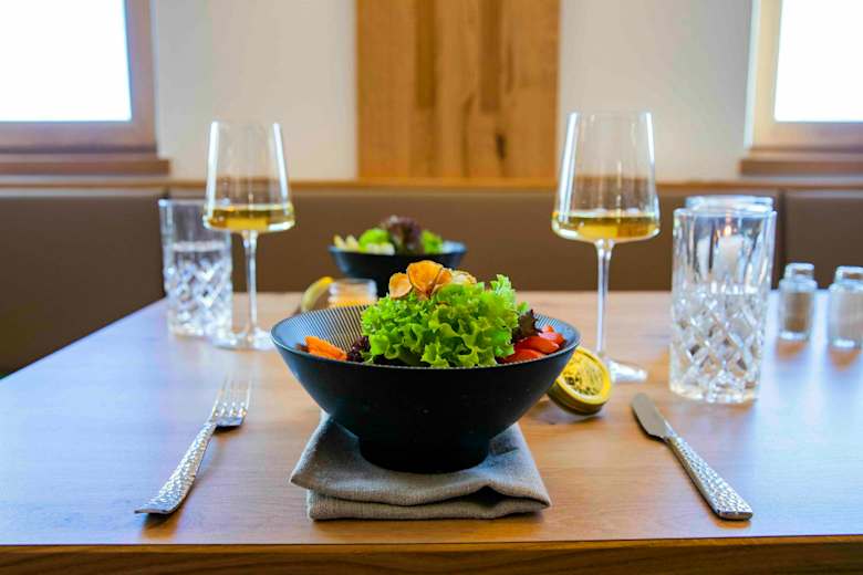 Auf der Hütte wird Wert auf regionale Speisen gelegt. Unter dem Motto „Moderne trifft Tradition“ gibt es zudem auch vegane und vegetarische Gerichte.