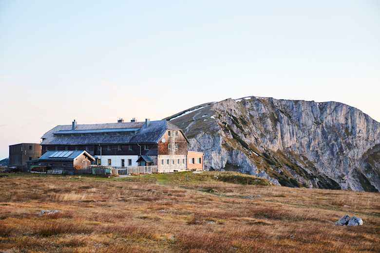 Nächstgelegene Hütte: Waxriegelhaus (1.361 m), die auf dem Bergabweg in 40 Minuten erreichbar ist. Weiters: Habsburghaus (1.748 m, 1 h), Neue Seehütte (1.643 m, 1:30 h), Ottohaus (1.644 m, 2:30), Rax-Alm Berggasthof (1.545 m, 3:40 h)