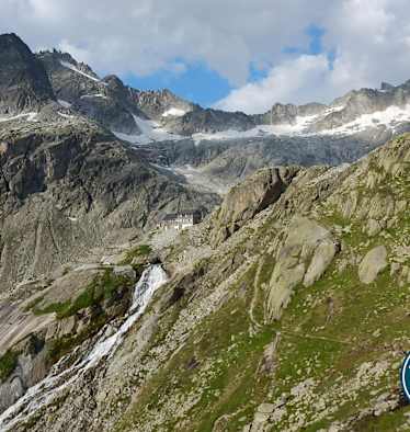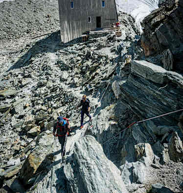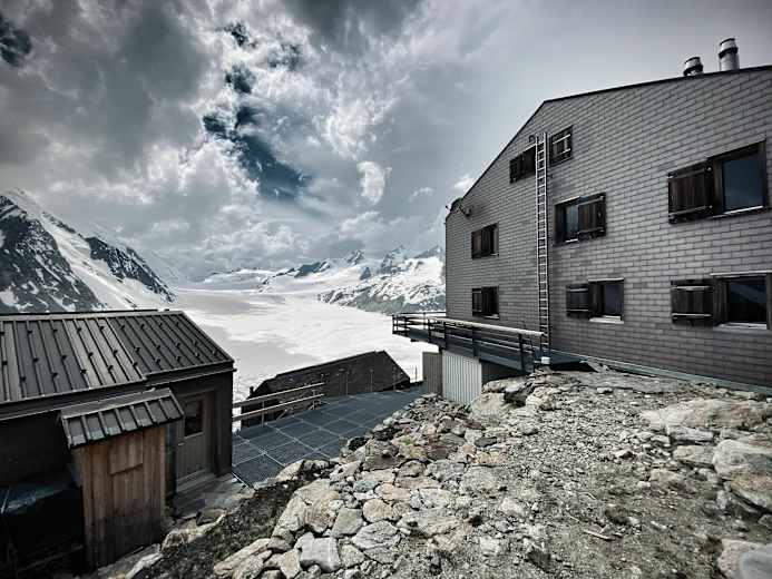 Die Konkordiahütte liegt auf 2.850 MeternFoto: Rebecca Gresch und Stefan GafnerZur Hütte gelangt man aufgrund von Gletscherrückgang über eine TreppeFoto: Rebecca Gresch und Stefan GafnerDie Hütte mit AletschgletscherFoto: Rebecca Gresch und Stefan Gafner