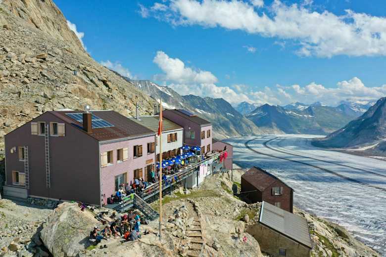 Schon 1877 wurde die erste Hütte am heutigen Standort, damals nur 50 Meter über dem Gletscher, errichtet. Seither wurde die Hütte mehrmals neu-, um- oder angebaut, sodass heute ein kleines «Gletscherdorf» fast 200m über dem Gletscher anzutreffen ist. Tagesgäste sind nur sehr selten auf der Hütte anzutreffen, da sie sehr abgelegen und der Zustieg weit ist. Dafür kommen viele Übernachtungsgäste. In Winter sind dies Skitourengänger, im Sommer Gletschertrekking-Gäste oder Bergsteiger. Gipfel wie das Gross Grünhorn, die Fiescherhörner oder die Jungfrau locken Gipfelstürmer in dieses Gebiet. Während die Crew im Hintergrund alles für das Abendessen bereit macht und die Gäste bedient, können Bergbegeisterte auf der Terrasse ein kühles Bier trinken und die wunderschöne Aussicht auf den Konkordiaplatz geniessen. Auch Gipfel wie das Dreieckhorn, das Aletschhorn oder die Jungfrau gehören zum Panorama. Der Komfort auf der Hütte ist nicht selbstverständlich. Wasser muss während der Schneeschmelze mühsam gesammelt werden und ist deshalb ein kostbares Gut. Sämtliche Lebensmittel aber auch Baumaterialien oder Brennstoff werden per Heli zur Hütte transportiert. Strom liefern eine Solaranlage und ein Dieselgenerator. Die Tage der Hüttencrew sind lang und die Arbeit auf 2850 Metern ist anstrengend. Belohnt wird man dafür mit der unbezahlbaren Aussicht und vielen zufriedenen Gästen.