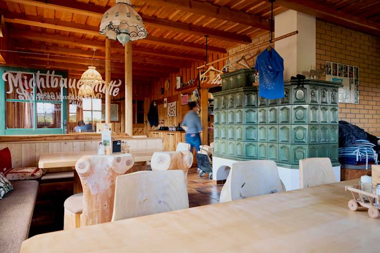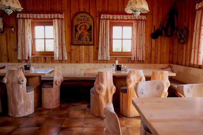 Vor der Hütte ist eine Sonnenterrasse, auf der in den stabilen Spätsommertagen freie Plätze nur schwer zu bekommen sind. Die Hüttenumgebung ist auch geeignet, um Kindern freien Lauf zu lassen und sie trotzdem nicht aus den Augen zu verlieren. Außerdem gibt es einen Streichelzoo mit Hühnern, Kaninchen und Meerschweinchen.