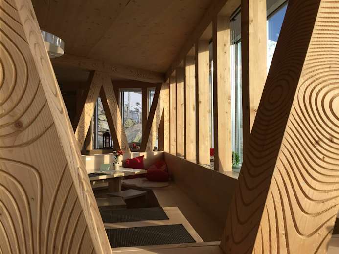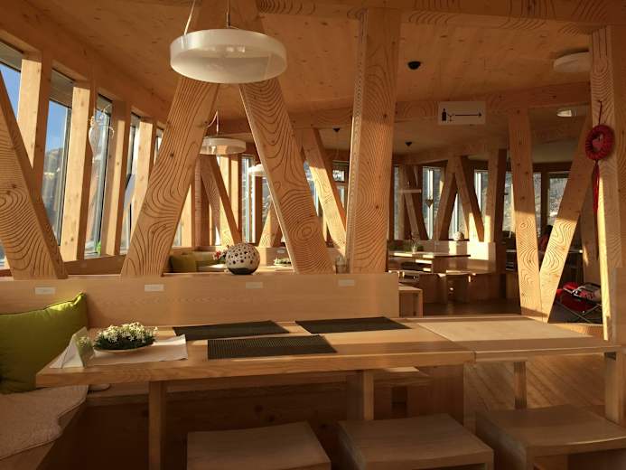 Innen besteht die Hütte aus Holz und ist sehr gemütlich und aufgrund der großen Fensterflächen hell zugleich. Dazu trägt auch die Freundlichkeit und Ruhe des Hüttenpersonals bei.