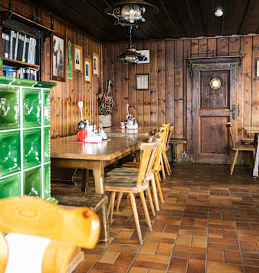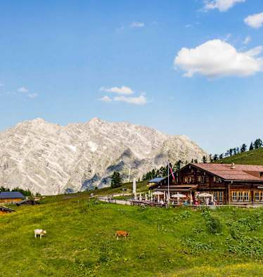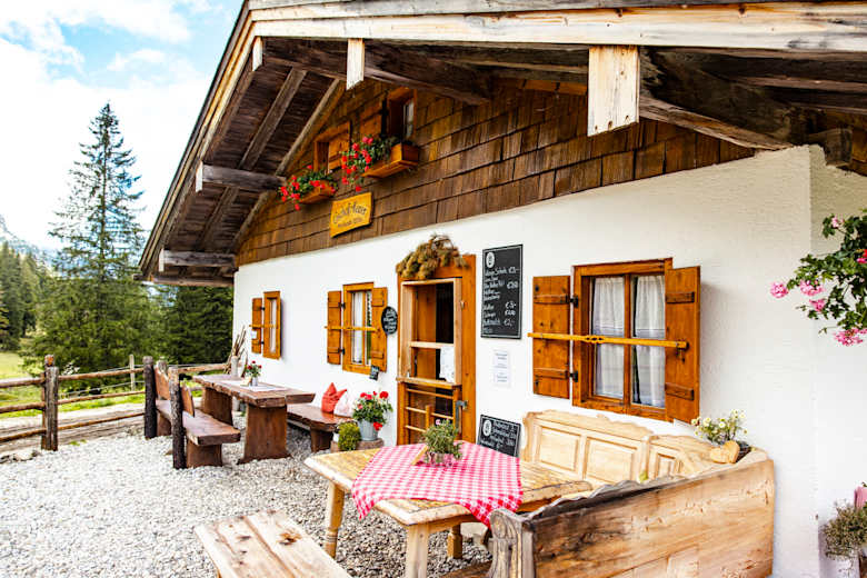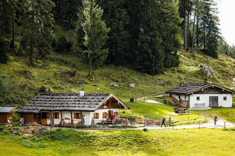 Auf der Speisekarte der traditionellen Alm stehen kleine, aber deftige Snacks wie Speck- oder Käsebrot, dazu gibt's frische Getränke. Atemberaubend ist die herrliche Aussicht auf benachbarte Berge wie den Watzmann (2.713 m) oder den Hochkalter (2.600 m).
