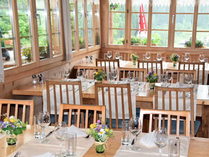 Das Prunkstück des Hauses ist der übergroße Holzherd. Er wurde vor rund sechzig Jahren extra für das Naturfreundehaus gebaut und verfügt über fünf Löcher zum Einfeuern. So konnten gleichzeitig fünf Parteien auf diesem Herd ihr Süppchen kochen. Heute brutzeln in den Bratpfannen auf dem großen Kochfeld vor allem feine Rösti, Käseschnitten oder ein gutes Stück Fleisch.