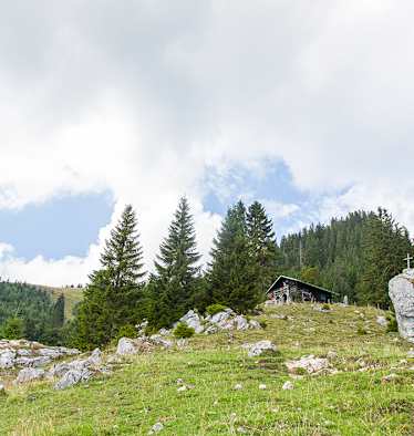 Die nächstgelegenen Hütten sind das Bodenschneidhaus (1.365 m, 45 min), die Albert-Link-Hütte (1.053 m, 1,5 h) und die Untere Firstalm (wenige Minuten entfernt).