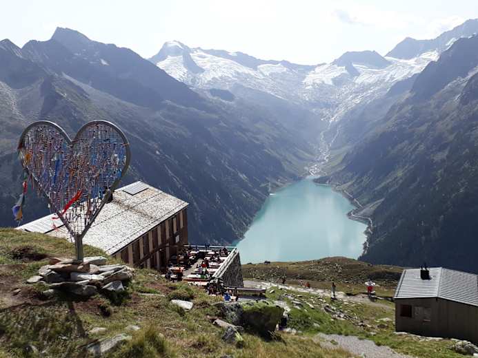 Aufgrund der südseitigen Lage im Riepenkar direkt unterhalb des mächtigen Olperers (3.476 m) sitzt man den ganzen Tag in der Sonne mit Blick auf das Gletscherfeld des Schlegeiskees oder die vereisten Gipfeln Hochfeiler (3.510 m), Großer Möseler (3.473 m) und Hochferner (3.473 m).