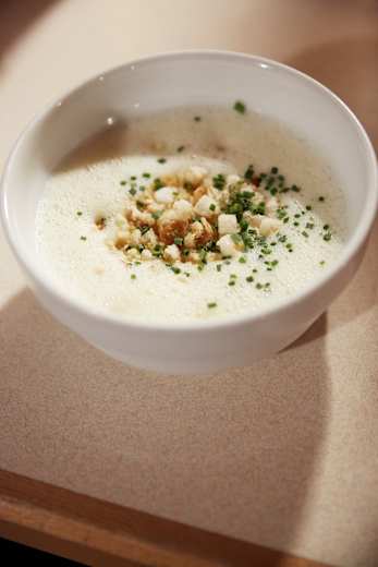 Vorspeise aus einem Fünf-Gänge-Menü der Hüttenwirte: Weißweinsuppe.Foto: Enno Kapitza, Bergwelten 01/2017