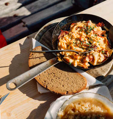 Vor allem für verwöhnte Feinschmecker lohnt sich ein Besuch. Die Wirte verwenden für die gschmackigen Speisen ausschließlich selbst hergestellte Produkte. Die Kuh- und Ziegenmilch wird hier direkt zu Käse und Butter verarbeitet. Für Interessierte erklären die zwei Sennerinnen gerne den Verarbeitungsprozess. Besonders die Kasjausn mit unterschiedlichen Käsesorten ist ein besonderes Geschmackserlebnis.