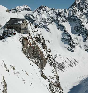 Ausgangspunkt für folgende Hochtouren: Alphubel (4.206 m, 1.500 Hm, 5 Std.), Rimpfischhorn (4.199 m, 1.500 Hm, 6:30 h) und Allalinhorn (4.027 m über Feechopf, 1.400 Hm, 5 h).