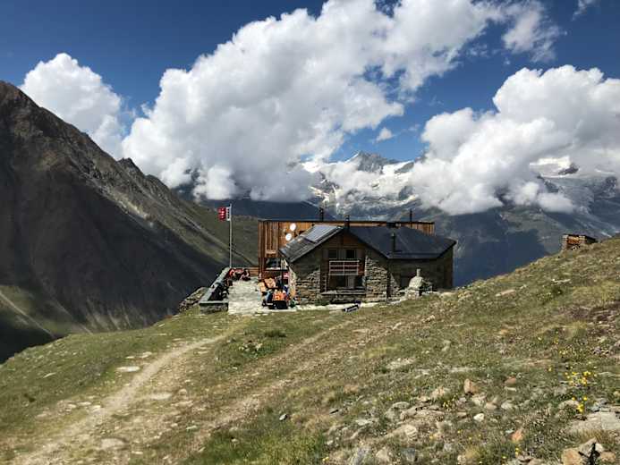 Dennoch ist alles etwas milder und vielleicht auch freundlicher als bei anderen Hütten, die als Ausgangspunkt für Viertausender fungieren: Der Zustieg dauert 1:20 h von der Täschalp und führt über einen bequemen, von Edelweiß-Blumen flankierten Weg. Die Hütte selbst liegt noch in der Grünzone auf einer sonnigen Aussichtsterrasse.