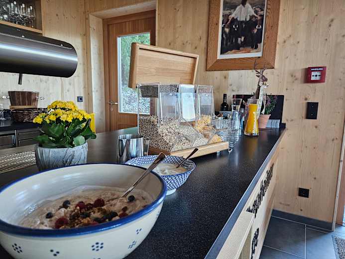 Besonderes Lob verdienen die frischgebackenen Kuchen wie Mohn-Nuss-Kuchen oder traditioneller Gugelhupf und der besonders flaumige Kaiserschmarrn. Milchprodukte wie Buttermilch, Käse oder Topfen ebenso wie der Speck auf der Brettljause stammen von regionalen Bauern. Empfehlenswert ist der selbstgebrannte Marillenschnaps.