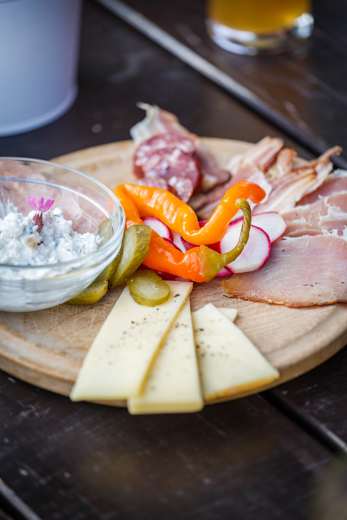 Brettljause mit Hauswurst von den Fritztaler Freilandschweinen.Foto: Marco Rossi, Bergwelten Magazin 03/2015