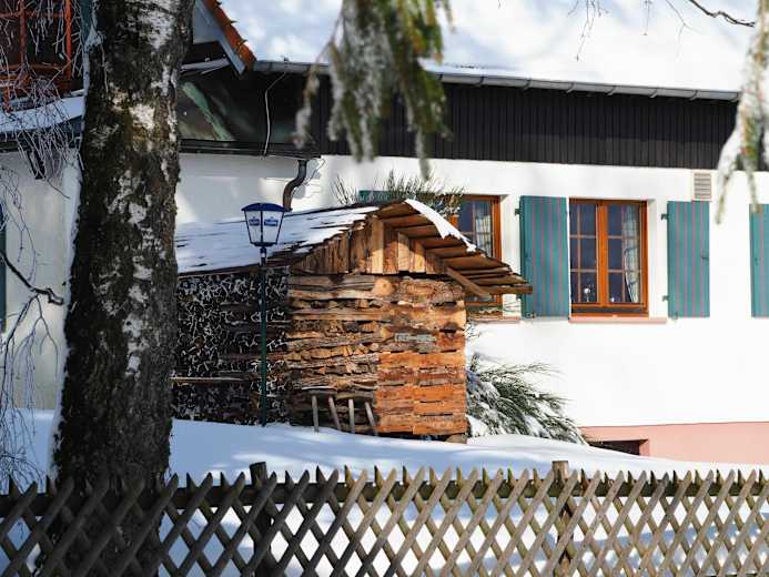 Die Wintersonne wärmt den Holzstapel beim Wanderheim KreuzmoosFoto: Lothar Dold