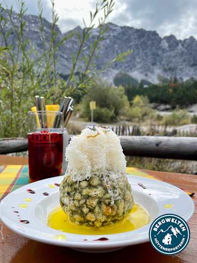 Kredenzt werden bayrische Köstlichkeiten, Frühstück, Brotzeiten, Eintopf- und Nudelgerichte. Aus der Küche sind die Kaspressknödel mit gemischten Salat, die Hüttenmakkaroni mit hausgemachter Schinken-Gemüse-Soße und Salat, der Leberkäse mit hausgemachtem Kartoffelsalat sowie das Gams- und Rindsgulasch mit Spätzle oder Knödel und Salat zu empfehlen. Beim Frühstück kann zwischen süß, deftig und gesund gewählt werden. Reichhaltig sind alle drei Varianten. Warme Küche von 11:30 bis 14:30 und von 17:30 bis 19.30 Uhr.