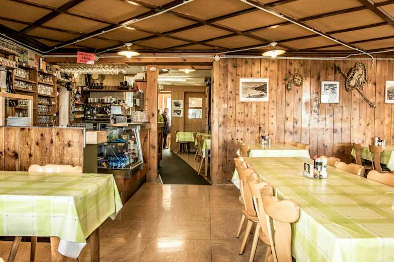 Für Frühaufsteher, die einen langen Tourentag vor sich haben, gibt’s bereits ab 5 Uhr Frühstück. Ein weiteres Zuckerl: warme und exzellente Küche ab dem Vormittag den ganzen Tag über. Direkt vor der Hütte befinden sich eine charmante kleine Kapelle, eine große Blockhaus-Sauna sowie ein Spielplatz für die kleinen Gäste auf der weiten Wiese. Gemütlich sitzt man auf der Aussichtsterrasse und in der Holzstube. Speis & Trank wird da wie dort serviert.