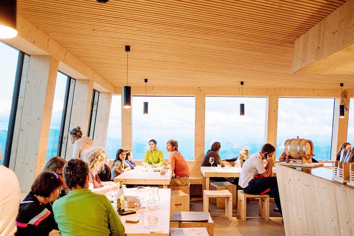 Aber der Bau ist nicht nur effizient, sondern auch elegant: Die Nutzungen sind vertikal übereinandergeschichtet und verleihen der Hütte die Form einer Zinne. In den unteren Ebenen befinden sich Trockenräume, Duschen, Tagestoiletten, Lager- und Technikräume. Von den Schlafkojen im ersten und zweiten Obergeschoß ist die Sicht nicht minder überwältigend als von der Stube aus, nur die Fenster sind kleiner. Ganz oben, über allem, die Privaträume der Pächterin.