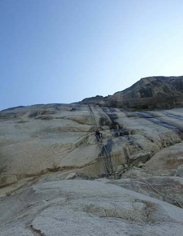 Nach ca. 300 Metern gelangt man an den Beginn des Bügeleisens. Hier geht es über einen kleinen Überhang (Haken und Schlinge) in 2 Seillängen gerade hoch bis ins Todesbiwak.
