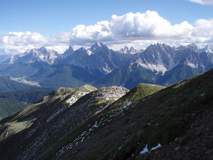 Im Weiteren wird das Toblacher Pfannhorn (2.663 m) überschritten und weiter über den Blankenstein (2.483 m) und das Marchkinkele (2.545 m), vorbei am Gumriaul (2.526 m) zur Hochrast (2.436 m) fortgesetzt. Von hier ist es nicht mehr weit zur Bergstation des Thurntaler Sessellifts (2.408 m) bzw. zur Seilbahn Gadein (2.100 m). Der Abstieg ins Tal kann hier bei Bedarf durch moderne Hilfsmittel abgefedert werden. Es sei erwähnt, dass sich die Gehzeiten auf geübte Bergwanderer beziehen und eine positive Höhendifferenz von ca. 2.300 Hm in zwei Tagen zu überwinden ist.