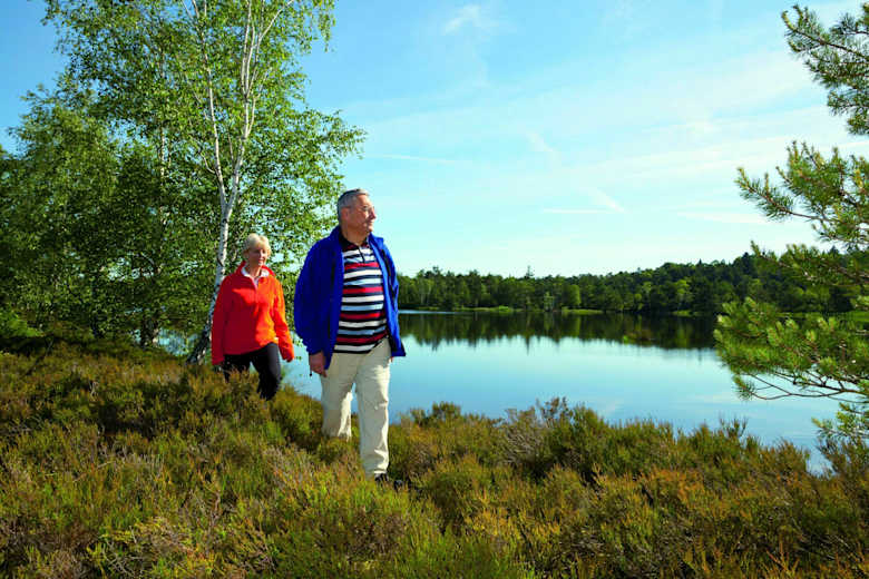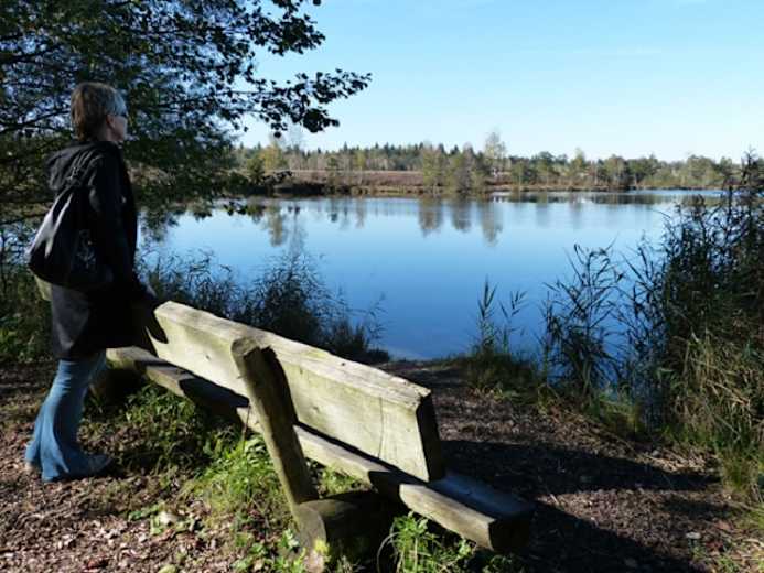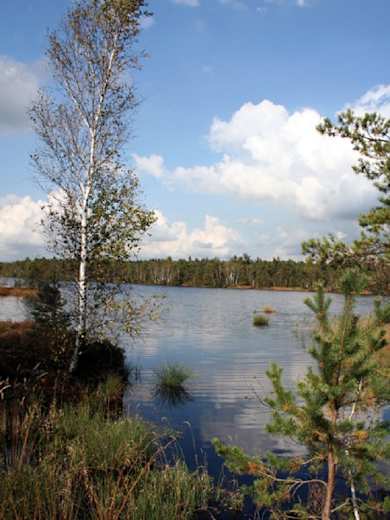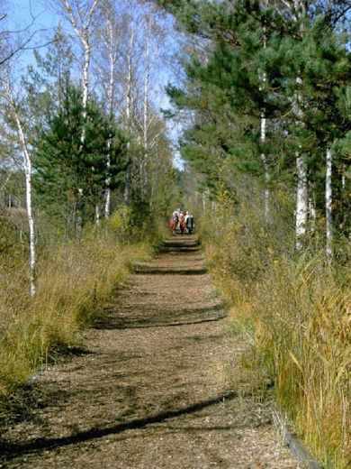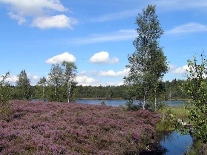Man erreicht einen Bohlenweg, nachdem man jüngere Moorwälder gequert hat. Man folgt der Markierung Rundweg nach links und gelangt über den breiten Wanderweg zum Moorsee. Von da ist es nicht mehr weit bis zum Parkplatz.