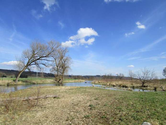 Nach etwa 2,5 km überquert man die Brücke der Bundesstraße. Zwischen Obstbaumwiese und Waldrand geht es hinauf zum Schlossberg. An der Ruine Güssenburg wartet eine schöne Aussicht ins Brenztal. Über den Schlossberg, die Sportanlagen und den Hirschberg geht es weiter zur Hürbemündung. Hier wurde durch die Renaturierung der Brenz wieder eine traumhafte Flusslandschaft geschaffen. Weiter geht es rechts über die kleine Holzbrücke auf einem Weg mit zwei geteerten Fahrspuren immer an der Brenz entlang. Unter der Bahnunterführung hindurch geht es unterhalb der Hangkante auf einer Wiese bergauf in Richtung Bergenweiler.