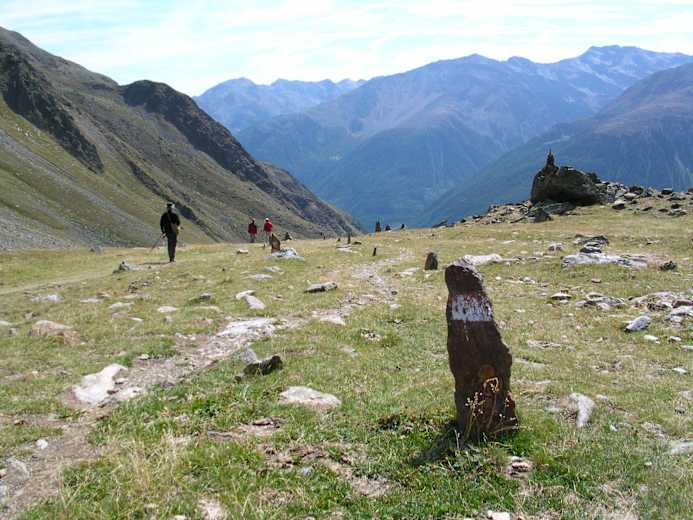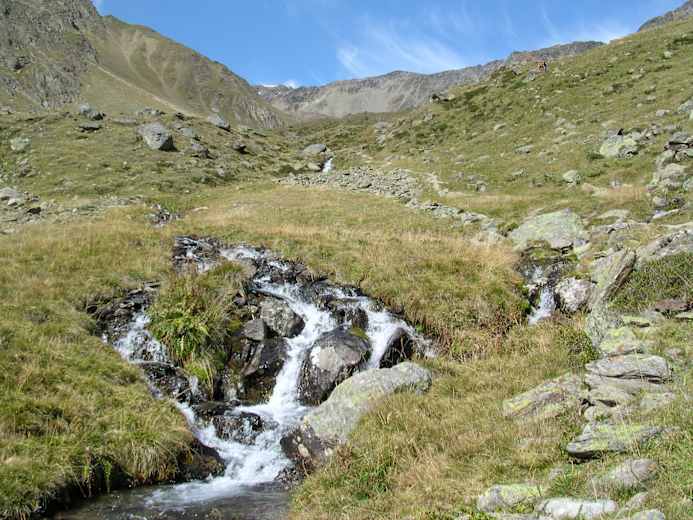 Hier zweigt man nun rechts ab, weiter auf dem Weg Nr. 2, in das Tisental, Richtung Similaunhütte. Der Pfad führt zunächst über Wiesengelände und dann durch einen schmalen Lärchenwaldgürtel hinauf. Oberhalb der Waldgrenze steigt man durch das breite Obere Tisental entlang des Bachverlaufes weiter bergauf.