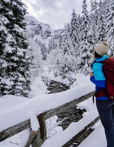 Die entspannende Winterwanderung von einer Stunde führt entlang des rauschenden Baches durch bezaubernde Nadelwälder von Corvara bis nach La Villa in Alta Badia in den Dolomiten in Südtirol.