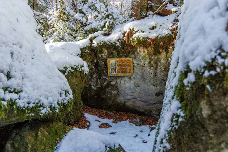 Ruhpoldings Märchenwald ist ein geheimnisvoller, mystischer Ort. Der Sage nach soll er im 13. Jahrhundert durch einen riesigen Einsturz der rund 300 Meter höher gelegenen Felswand entstanden sein. Durch die Eigenart des Gesteins haben sich Grotten gebildet und kleine Höhlen und alles ist mit Moos überzogen. Sonnenlicht fällt durch das dichte Geäst der verschneiten Bäume und es gibt sogar eine verwunschene Glücksgrotte und eine Bärenhöhle aus früheren Zeiten.